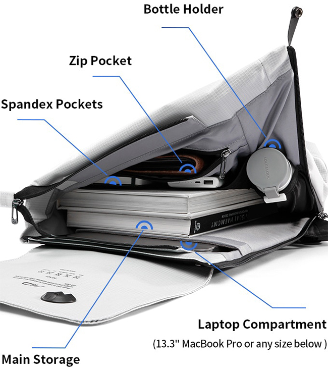 一番大きい「Everyday Backpack」は、ノートPCやボトルの専用ポケットを搭載。貴重品や分厚い本まで入れてもかさばらない。