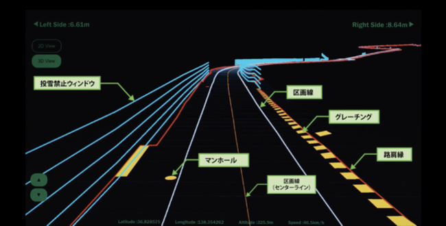 除雪車と接触する恐れがある道路上の構造物(路肩、ガードレール、マンホール、グレーチング、 橋梁ジョイントなど)や雪で覆われた道路の形状を見える化。