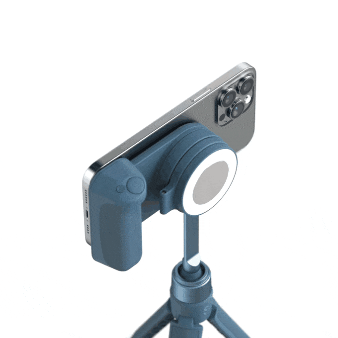 「SnapGrip」にはオプションとして、自撮り棒にもなる三脚の「SnapPod」と、リング光源の「SnapLight」が用意されている。これらもマグネットで装着できるしくみを採用しているから、「SnapGrip」にスタックして装着できるし、もちろん単体でもスマートフォンに装着して使えるようになっている。