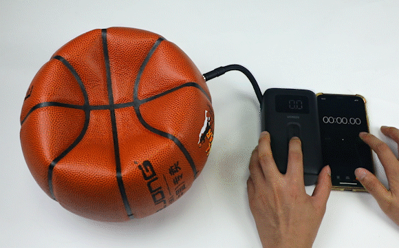小型なのにパワフル。74Wのモーターを内蔵していて15L/minの空気を送り、バスケットボールなら全く空気の入っていない状態からわずか20秒でフル充填できる。