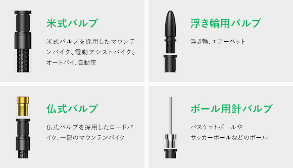 付属するバルブは4種類。差し込み口が小さい物から広いものまで対応可能。