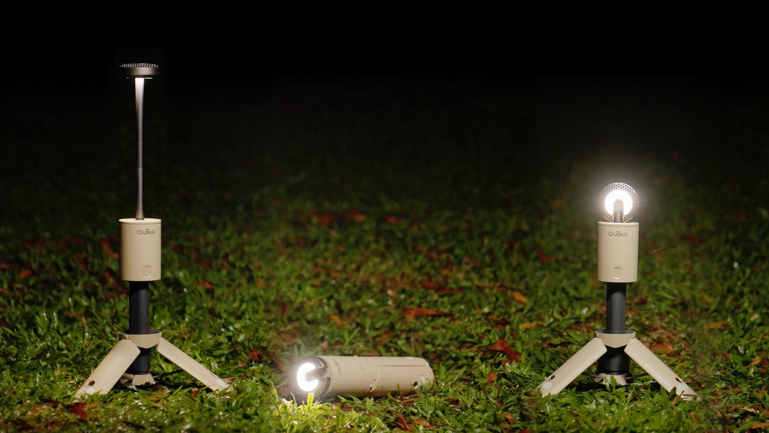 「ouTask」は、円柱型の多機能な懐中電灯だ。マグネットタイプの三脚が付いており、地面・床で自立するのはもちろん、車のボディなどに吸着してくれる。