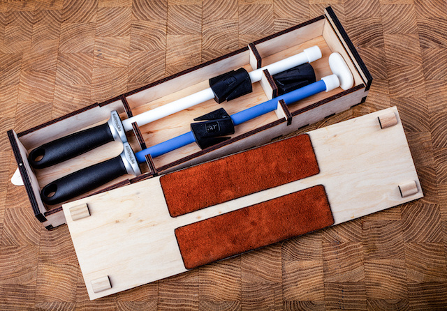 収納ボックスの裏側には仕上げに使う革が張られおり、包丁を数回スライドさせることで微細なバリを取り鋭い切れ味に生まれ変わるという。研ぎ棒専用のゴムクリーナーも付属し、金属汚れやバリのメンテナンスができる。
