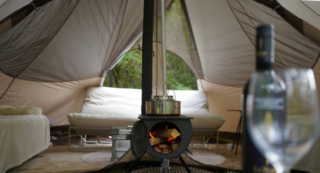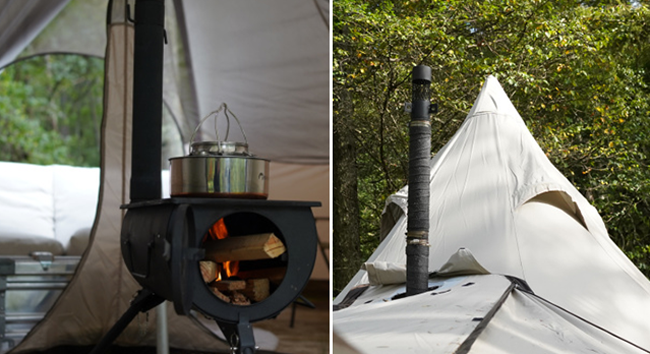 ファイバーグラスでできた薪ストーブ用の煙突孔がついているから、冬でも暖かく過ごせるだろう。利用の際は、テント本体の生地への引火に注意し、テント内には一酸化炭素探知機を設置して、安全面の配慮を忘れないようにしたい。