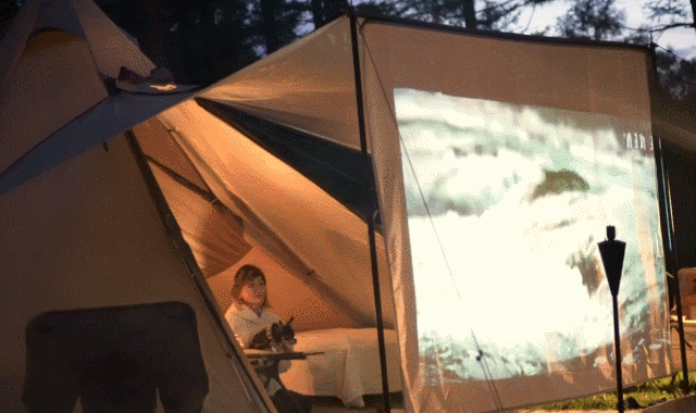 DOCODEMO RESORTには、付属のプロジェクター用スクリーンをキャノピー部分に設置可能。映画や動画を楽しみながら、ゆっくり料理やお酒も楽しめる。