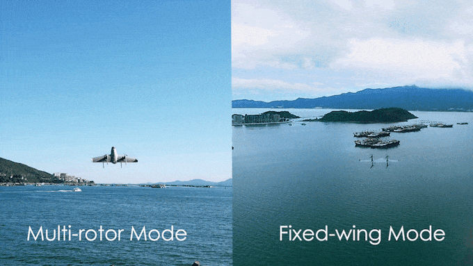 4つのプロペラを使ったマルチローターモードと、固定された翼を使った固定翼モードの2つのフライトモードで飛行できる。