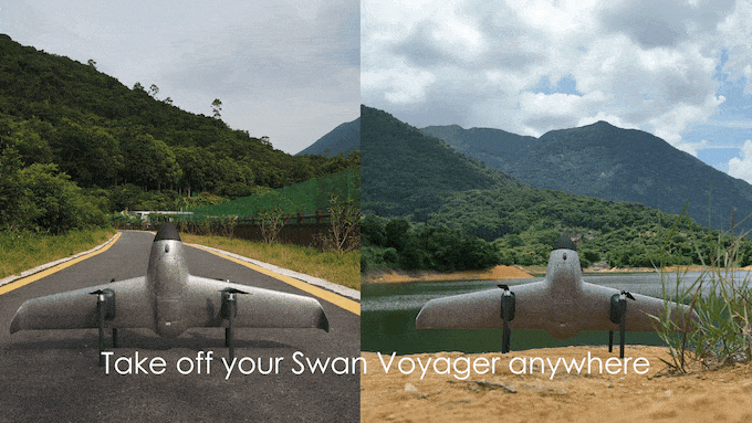 「Swan Voyager VTOL」は、4枚のプロペラと2枚の固定翼を搭載する垂直離着陸ドローン。機体はドローンとしてイメージしやすいマルチコプター型のモードと、航続距離が稼ぎやすい飛行機型ドローンが1つになったようなもの。