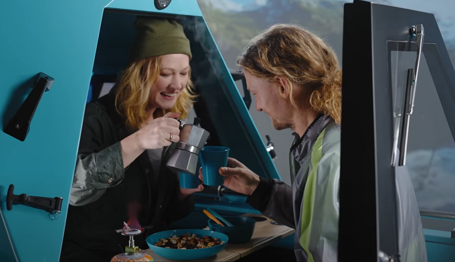 水陸のどちらでも、貨物部の屋根を動かして折りたたみ式テーブルを設置すれば、キャンプのように楽しめる。向かい合って食事をとることが可能だ。