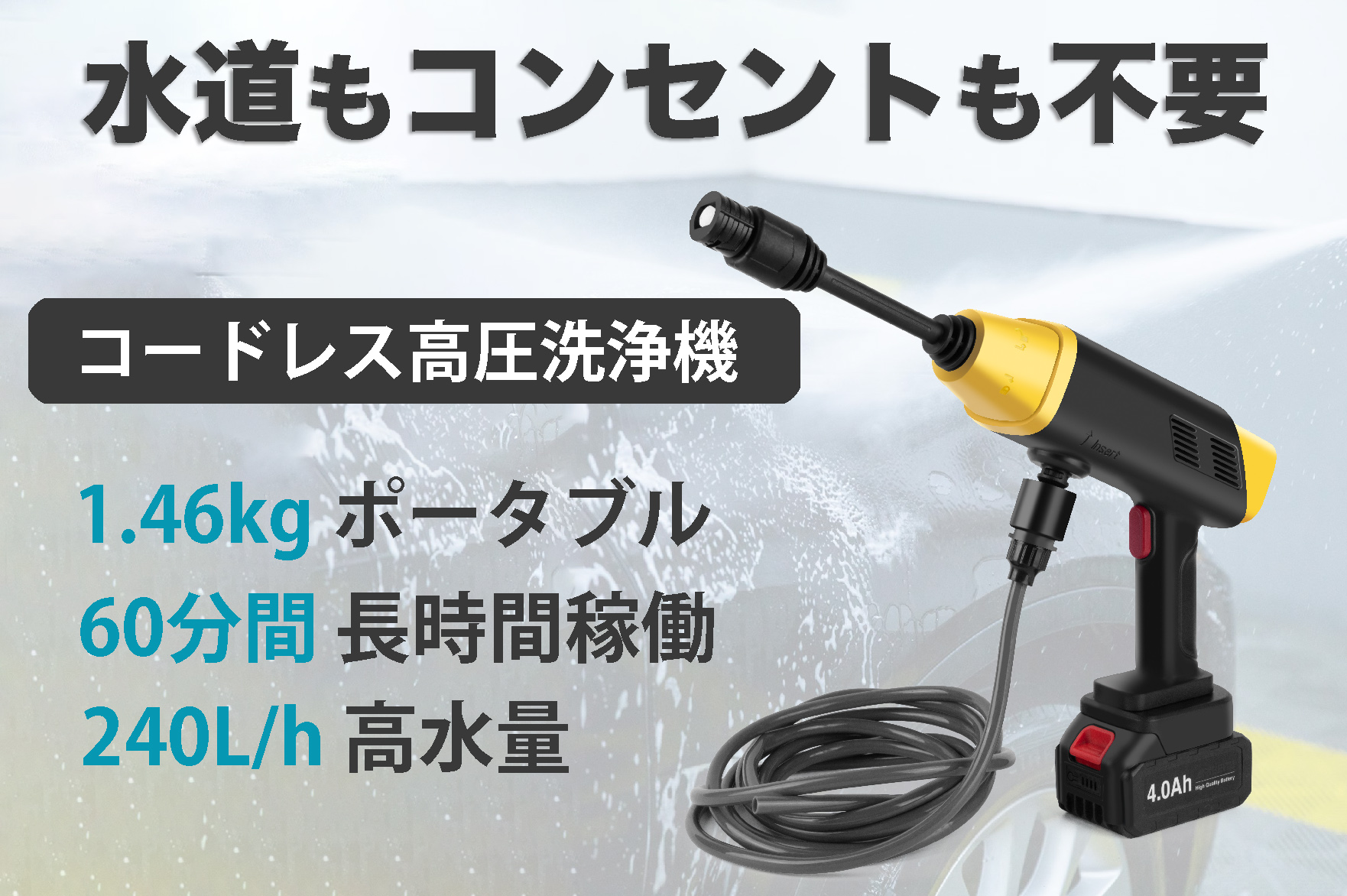 「L3」は、水圧約3.5MPaの高圧洗浄機。洗車や床掃除はもちろん、水撒きなどにも役立ってくれる。バッテリー式・自吸式で、コンセントと水道がないところでも使えるのが利点だ。