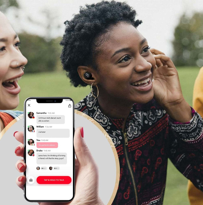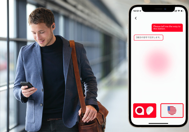 イヤホンのボタンを押しながら話すだけ。自動的に相手の言語を翻訳され、音声で再生される。また、スマートフォン側でも文章化して表示されるので、スムーズな会話が可能。日常会話から海外とのオンライン会議まで、1対1の会話で活躍するだろう。