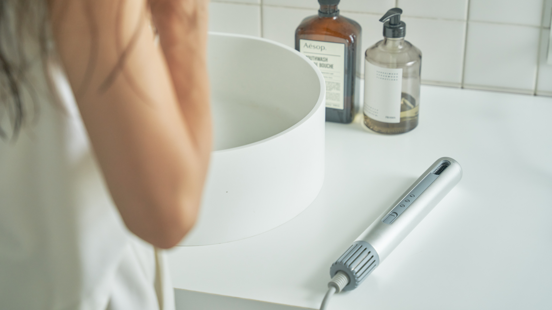 「baton」は直径約38.5mm、高さ約277mm。洗面台に置いても、持ち歩くにもコンパクトだ。一般的に1.5㎥/min以上の風量があるドライヤーは大風量と呼ばれているなか、2.0㎥ /minの大風量ヘアドライを、重さ約298g(電源コード、カールブラシを除く)の軽量で体感できる。