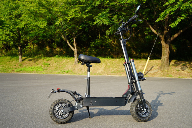 タイヤは、11インチの大口径オフロードタイヤ。油圧式のフロントフォークサスペンションと共に振動などを吸収して、路面状態を問わず快適に走れそう。