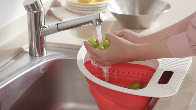 野菜や果物を両手で洗える上、食材の落下や水の飛散も防ぎやすい。湯切りもお湯がかかりづらく安全で、缶詰や冷凍食品の開封にも便利。