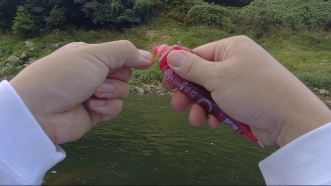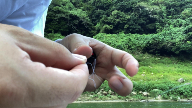仕掛けセットの先に針がついているので、練り餌を直接つけていきます。
