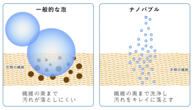 「バブリッシモ」は、1ccあたり2千万個以上ものナノバブルを発生させる。ナノバブルが繊維の奥まで届き、汚れが落ちやすくなるという。