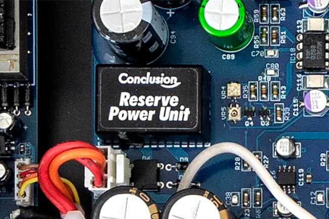 電源は、音楽信号によって絶えず負荷が変動する電流に負けない、リザーブ電源を特別にカスタマイズ。通常のトランス電源と比べて、変動電流が3分の1以下に抑えることで、安定した電源をアナログ回路に供給できるという。また、高周波を扱うチューナー部分には、別の電源トランスを搭載することで、アナログ音声へのノイズを徹底的に排除し、音質が安定するという。