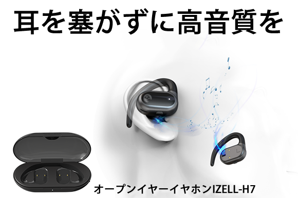 「IZELL-H7」は、人間工学に基づいてデザインされたオープンイヤータイプのイヤホン。耳の中に入れないから、長時間装着しても疲れにくく、周囲の音を取り込みながら音楽を聞けるという。遅延は約0.06秒。音声と映像にほぼズレを感じることなくゲームを楽しめるとしている。通話用のマイクも搭載する。