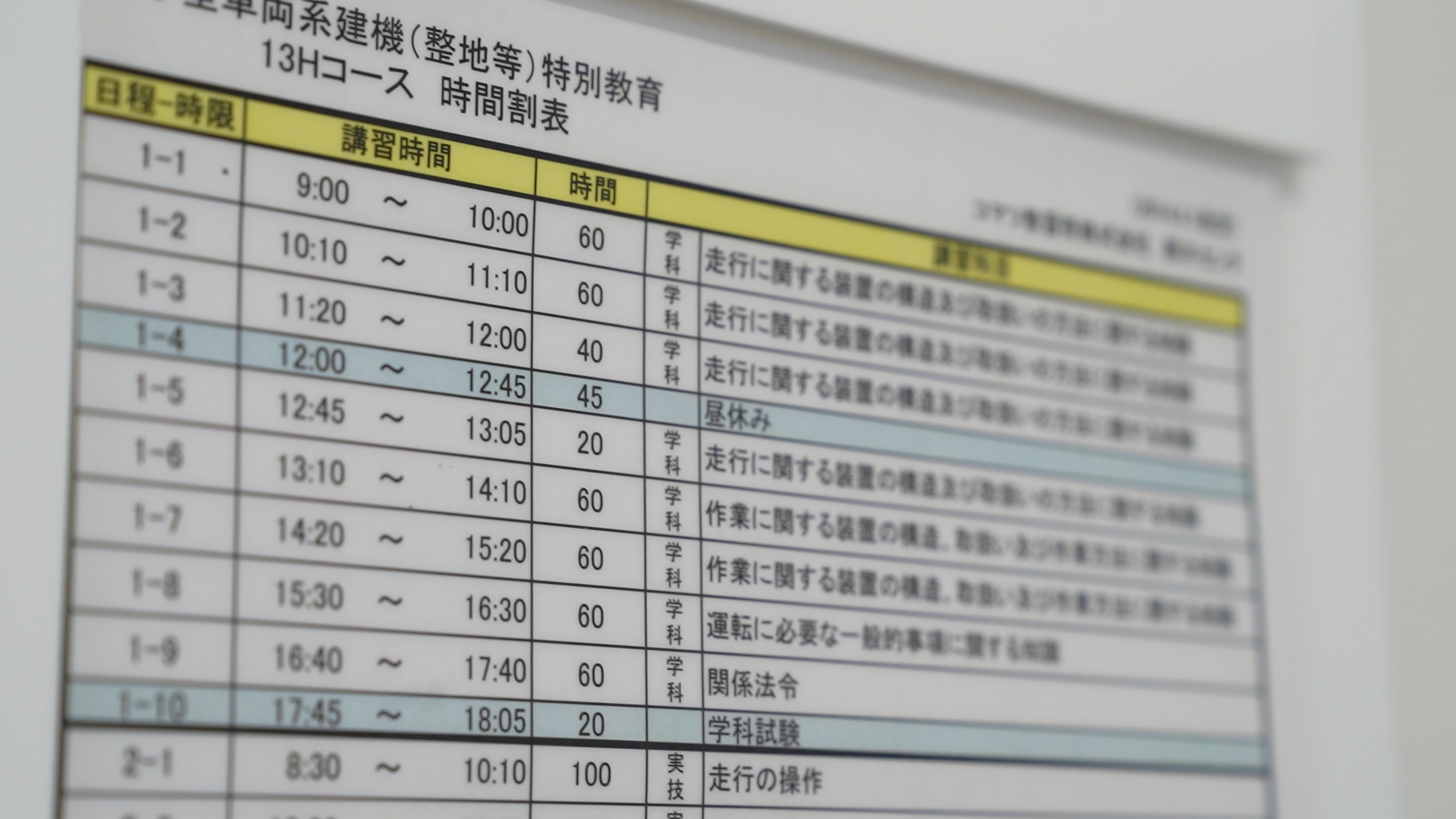 3t未満の小型車両系建設機械運転特別講習は、2日間。コマツ教習所のWebサイトから、講習の予約ができる。場所によってはスケジュールが埋まっていることもあるそうで、余裕をもって予定を立てた方がよいだろう。
