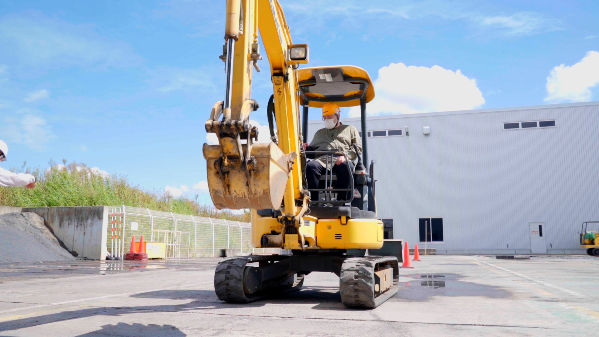 走行に慣れた津田氏は旋回操作をしたり、アームを動かして実際に砂利を掘ったり、地面をならしたりと実技をこなしていった。運転席からだとアームやバケットの角度が把握しづらいが、何度も動かしているうちに体で感覚をつかんでいくらしい。
