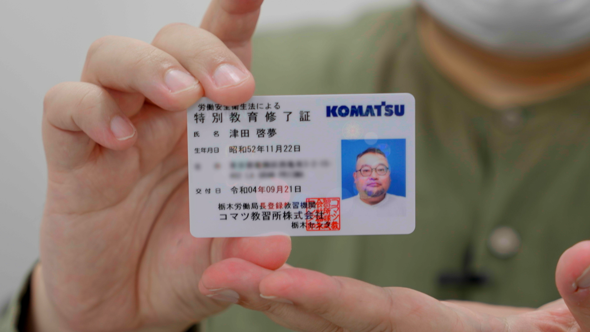 小型車両系建設機械運転特別講習(3t未満)の技能資格証明書と特別教育の修了証を獲得した。これにより機体質量3t未満のショベルカーやブルドーザーなどを運転できるようになる。