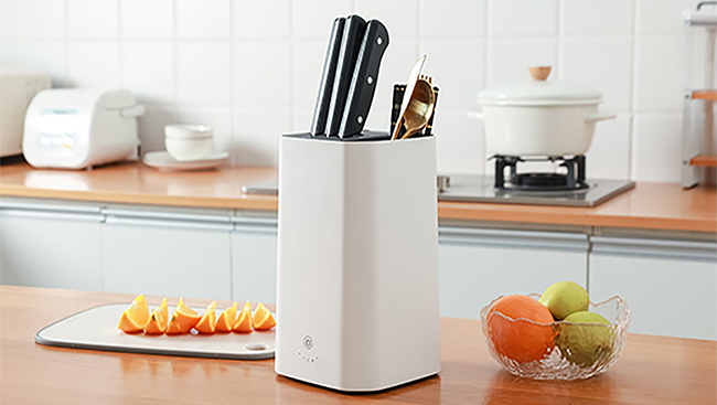 「ARTDOORドライクリーンスタンド」は、洗った包丁やカトラリーをそのまま収納でき、ボタンを押すと約70℃の熱風で乾燥。さらにUV紫外線も40分間照射される。4時間毎に自動で繰り返す機能も搭載する。