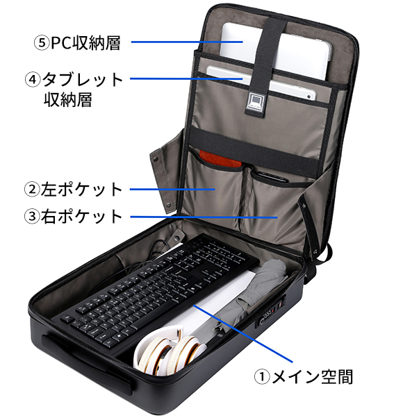 「GatherRuck」の表面は撥水性の高いABS素材を使っている。一方で内部は柔らかな綿製。電子端末の表面を傷つけにくい設計だ。ほか、サニタリー用品など、水気のあるものは分けて収納できる。
