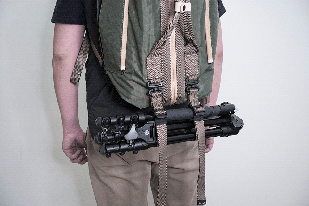 さらに、オプションのストラップを付けたら、テントや寝袋、三脚などを固定して運べる。
