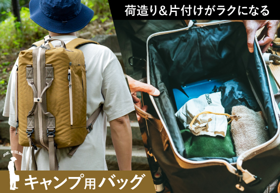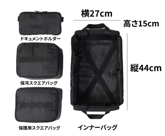 バッグ内を整理しやすいバッグインバッグが4種付属する。保冷用バッグやドキュメントホルダーなどがあり、アウトドアや旅先でも重宝するだろう。