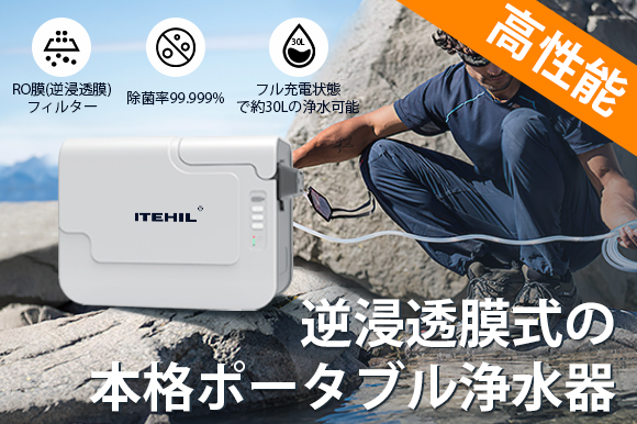 「ITEHIL」は、逆浸透膜フィルター(RO膜)を採用したポータブル浄水器だ。雨水や未処理の淡水などを浄化できる。メーカーは中国のKINGWORKS。