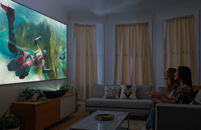 「Philips Screeneo U5」は、壁から約10cmで80インチ、42cmで150インチの大画面投影が可能。映像は4K UHD。鮮やかな色とシャープなコントラストを映し出す。