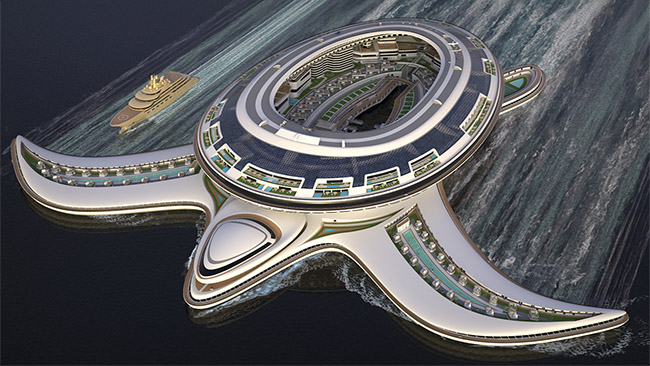 全長550m・全幅610mの巨大なウミガメ型船舶は、ホテル・アパート・カジノ・ショッピングモール・公園などあらゆる施設を有し、最大6万人を収容する構想だ。さらに小型船の停泊港や小型機の離着陸スペースも設けるという。