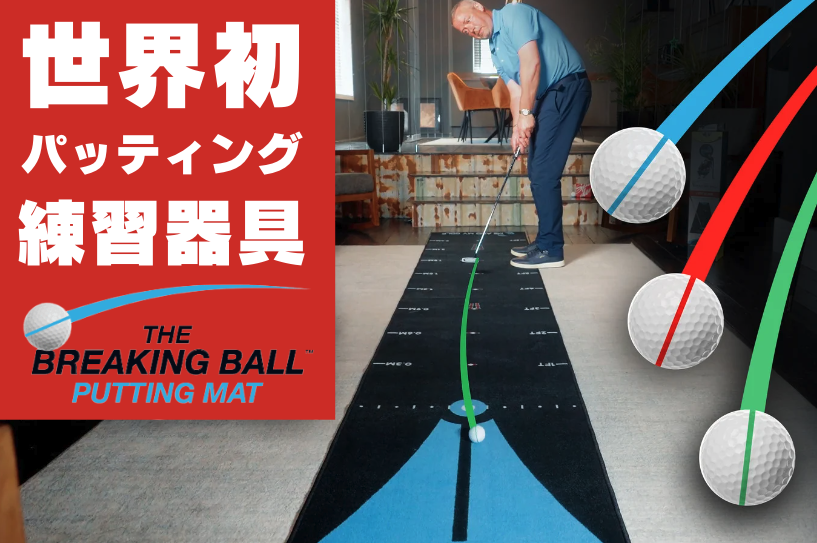 「ブレイキングパット&マット」は、特許技術で作られた左右に曲がる「ブレイキングボール」と、ブレイキングボール専用のパッティングマットで、自宅にいながらフック、スライスの左右に曲がるラインとストレートライン全てを練習できる。