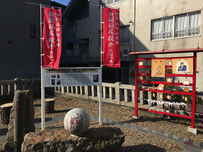 強靭な足腰は漁師だった父の手伝いで、揺れる伝馬船を漕いでいたおかげともいわれ、絵馬掛け台には伝馬船を漕ぐ親子の肖像画が掲示されている。別名「稲尾神社」とも称され、氏の功績にあやかり必勝祈願の願掛けも多い。