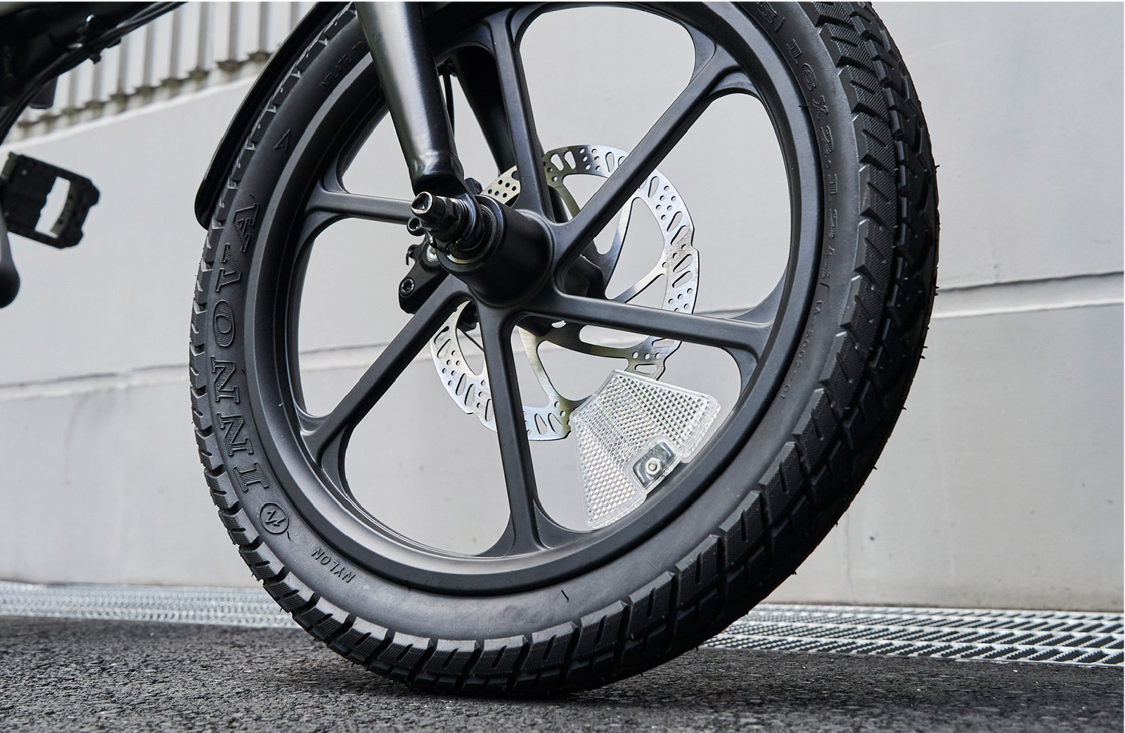 タイヤは、一般的に使われているチューブタイヤではなく、タイヤ内に発泡樹脂を使用したノーパンクタイヤが使われている。