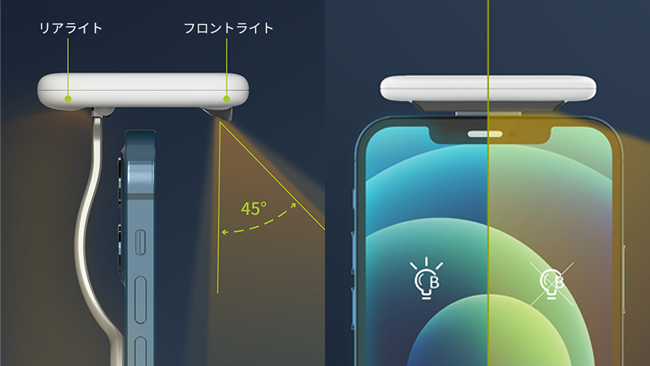 リアライトは、周囲を明るくすることで、画面光との明暗コントラストを調整。暗い部屋でスマホ画面だけが明るい状態を防ぎ、画面のまぶしさが和らぐことで目に負担をかけにくいそうだ。