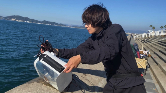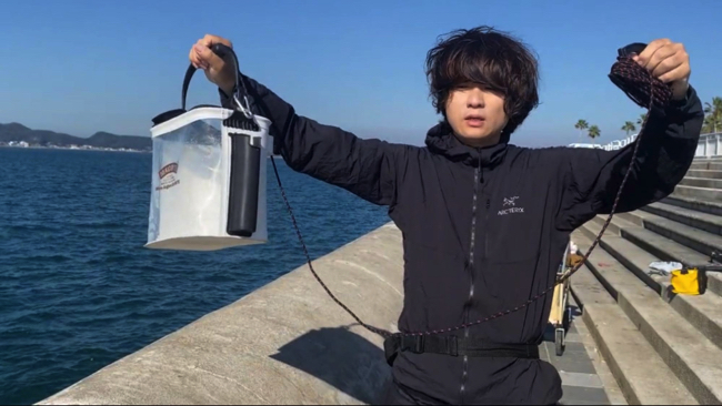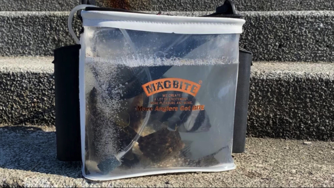 エアーポンプも装着可能。釣れた魚をバケツに入れて、元気を保てます。観察が終わったら、食べない魚は逃がしてあげましょう。