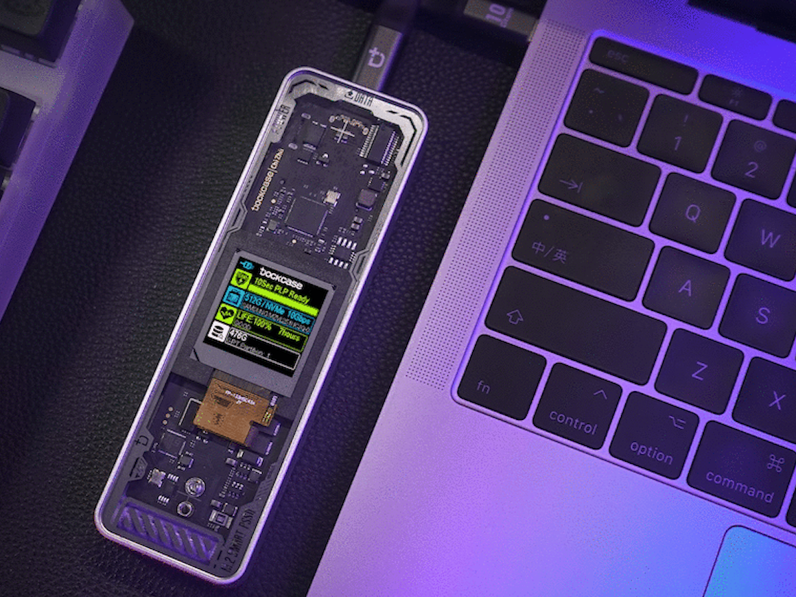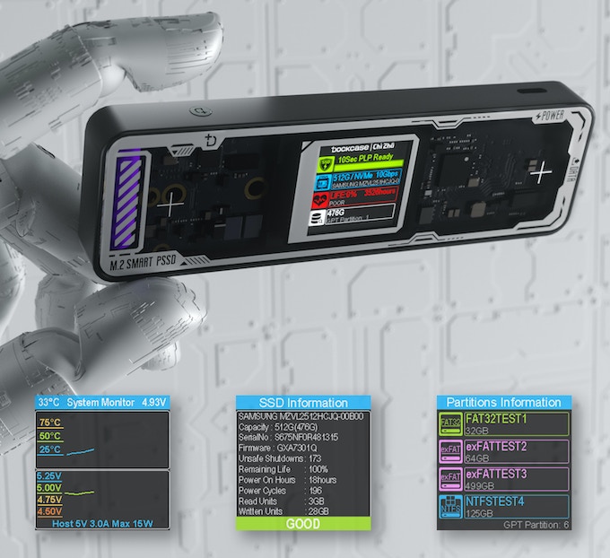 ディスプレイ付きでSSDの状態をリアルタイムで監視。SSDの交換時期を知らせてくれる。