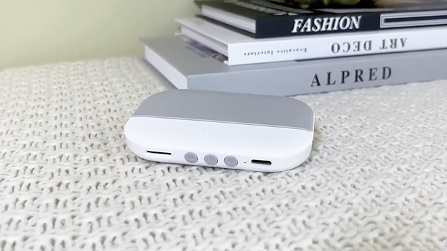 「LeYin」の最大の特徴は、枕の下に置いて使うこと。内蔵の2つのスピーカーから全方位に再生され、横になると骨伝導技術と同じように音楽が聴ける。