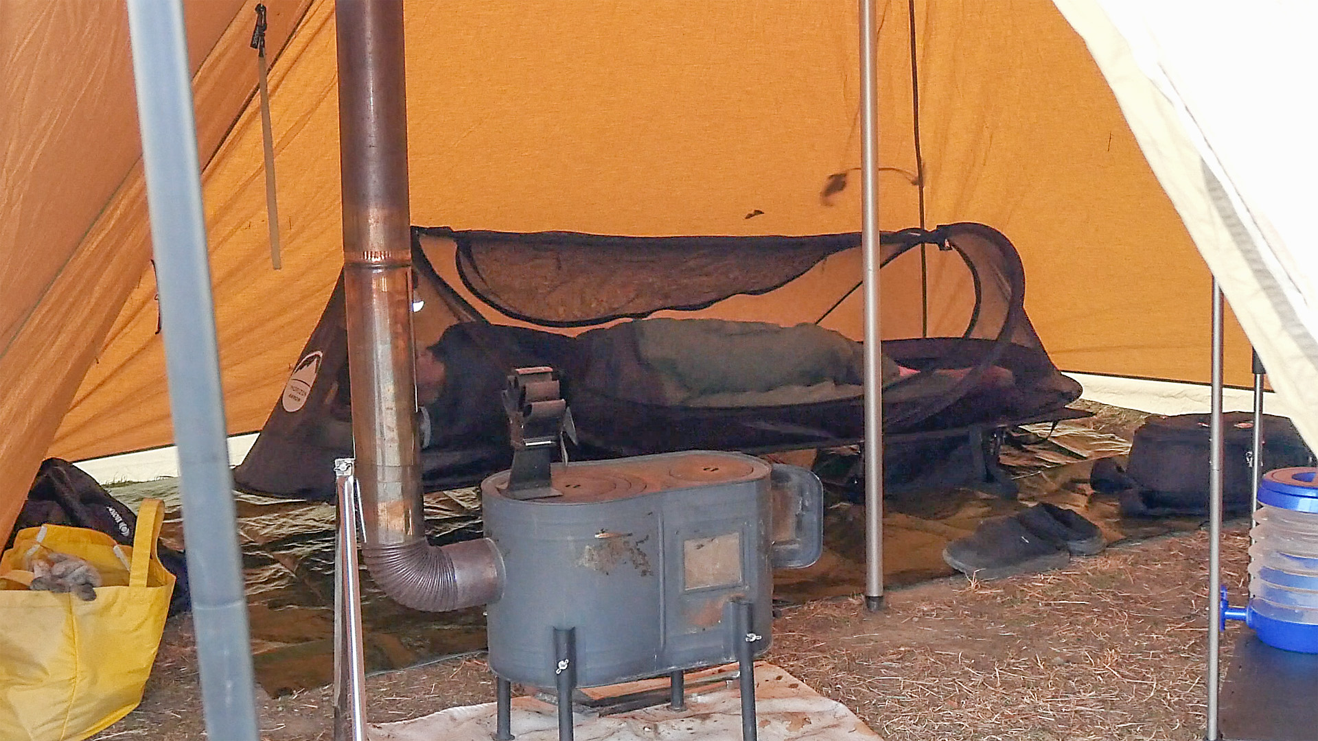 今回は冬キャンプということで、テントの中にテントを入れるカンガルースタイルで使ってみました。冬だとコットやマットが冷気を軽減してくれますが、寝袋に暖かく就寝できる秘密があります。