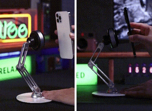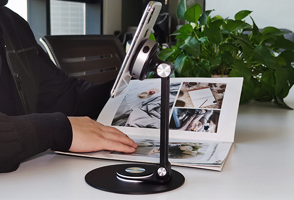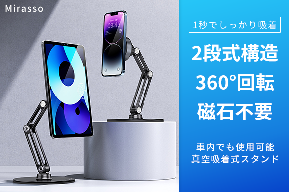 「Mirasso」は、スマホやタブレットなどを真空吸着して固定するスタンド。高さや角度も自由に変えられる。