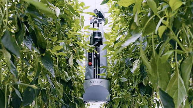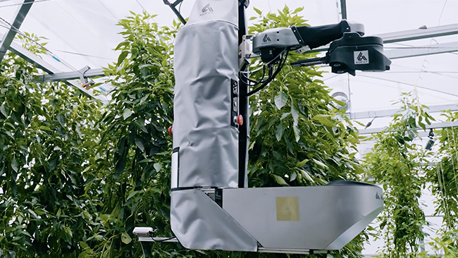 日本のベンチャー企業が開発したAIロボット「L」は、搭載カメラで収穫に適した作物を認識し、アームでピッキングしてロボット内のかごに収穫していく。