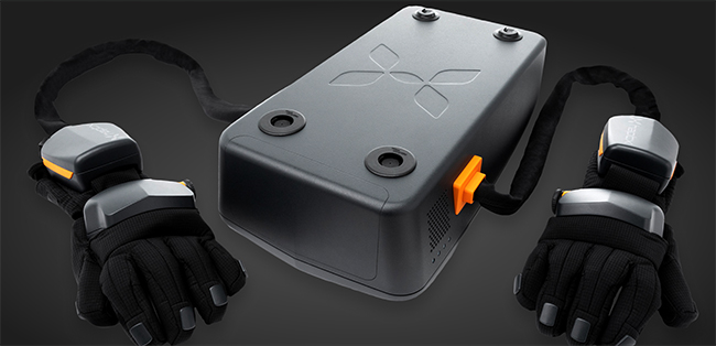 「HaptX Gloves G1」は、リュック型エアパックから空気圧が送られ、135個の流体アクチュエータが皮膚を動かし、リアルな触感をもたらす。