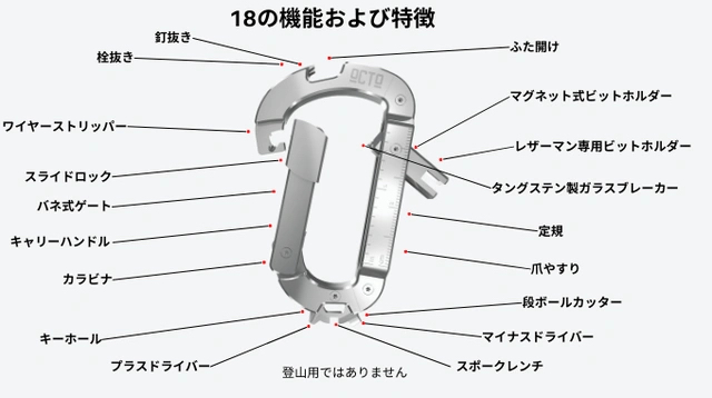 18の機能を持つマルチツールに! 便利過ぎるチタン製カラビナ「OCTOカラビナ」