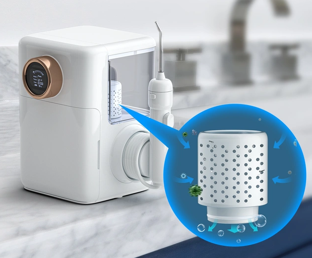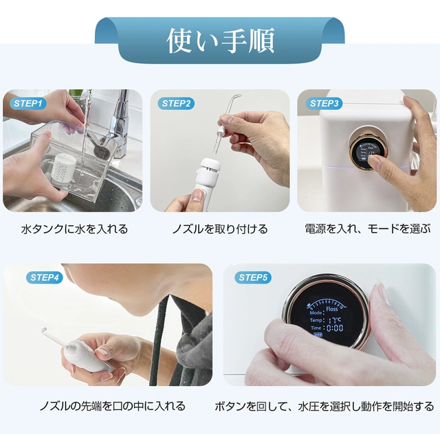 5種類のアタッチメント(ジェットノズル、歯周ポケット用、歯垢除去用、矯正用、舌用)用途に合わせて取り替えられる。使用後、UVライトを自動的に約2分間照射する。
