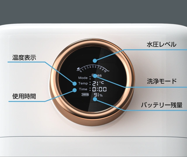 側面のディスプレイは、洗浄モード、水圧レベルやバッテリー残量などを表示する。