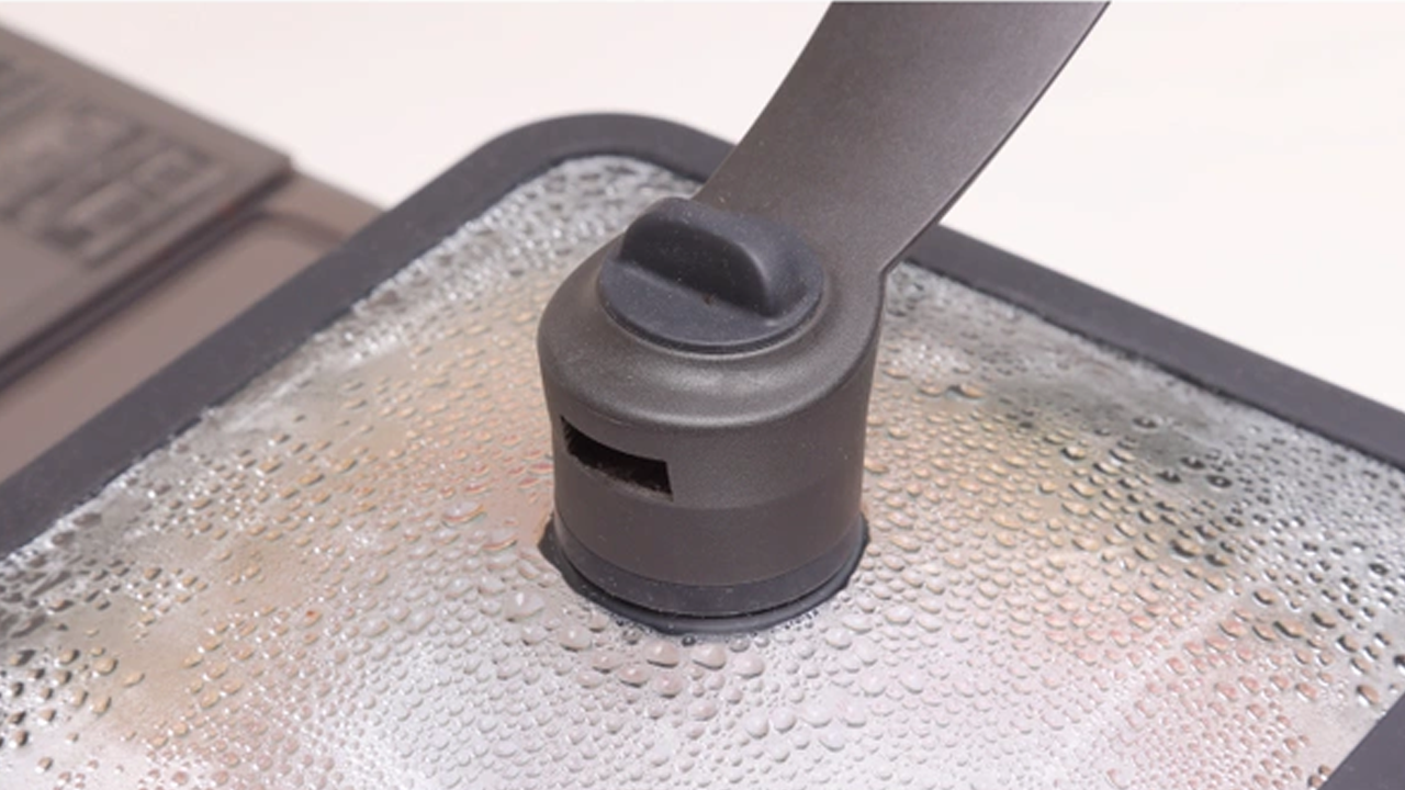 20cmマルチパン専用フタのみ蒸気口がついており、つまみをひねることで蒸気口が塞がり無水調理が可能となる。蒸気口内には150gの重りがプラスされ、蓋と鍋の密着度もUP。食材の水分だけで調理するので、食材の栄養を逃さず、旨みを凝縮してくれるという。