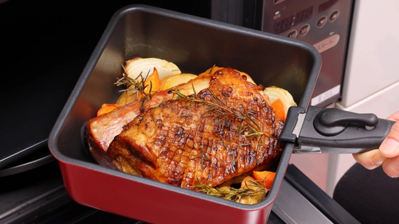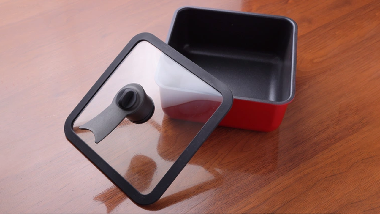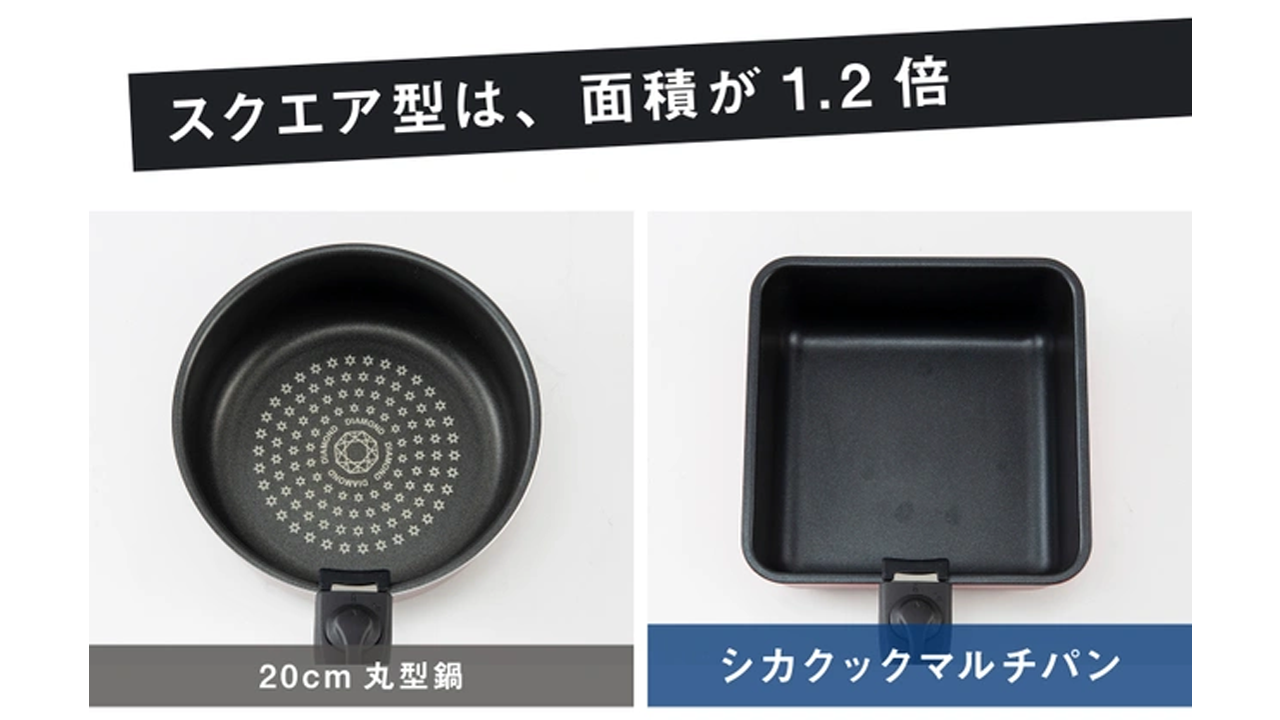 「シカクック」は、その名の通り四角い調理器。煮る、焼く、蒸すなどが一つの鍋ででき、20cmマルチパンは専用フタを使えば無水調理もできるという。