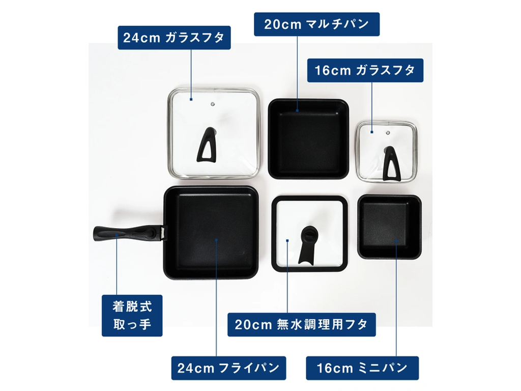 「シカクック」は20cmマルチパンの他にも24cmフライパンや、16cmミニパンなど取り揃えており、20cmマルチパン単体か、フルセットでの購入を選べる。それぞれ専用のフタがついていて、マルチパンのみ無水調理ができる専用フタとなっている。