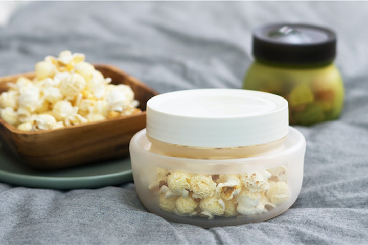 「Flexi Jar」は、フタをして押し込むだけで空気を抜いて、中の食材を湿気や酸化から防ぐ。