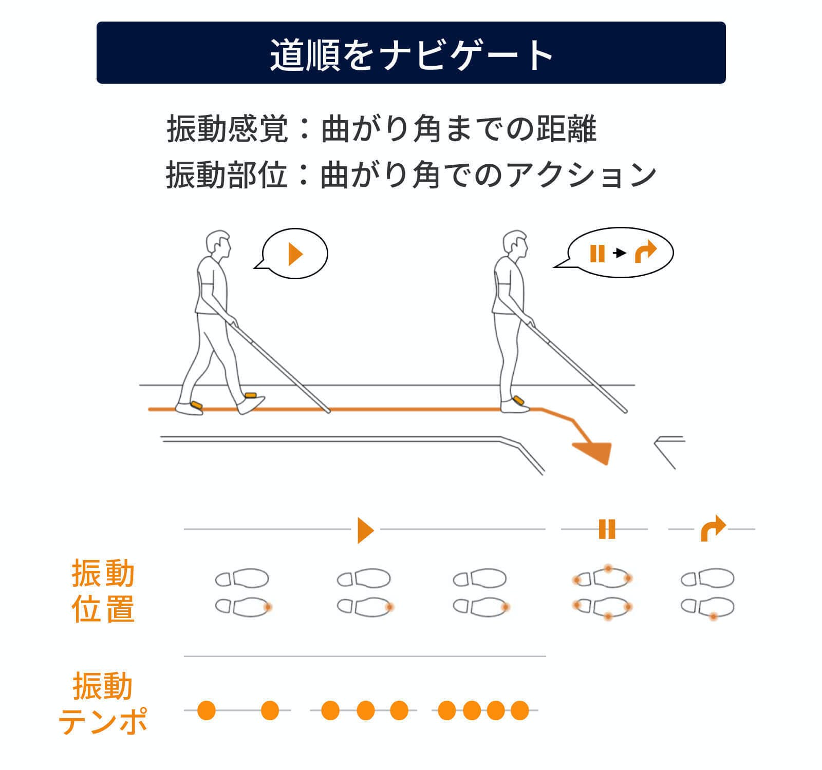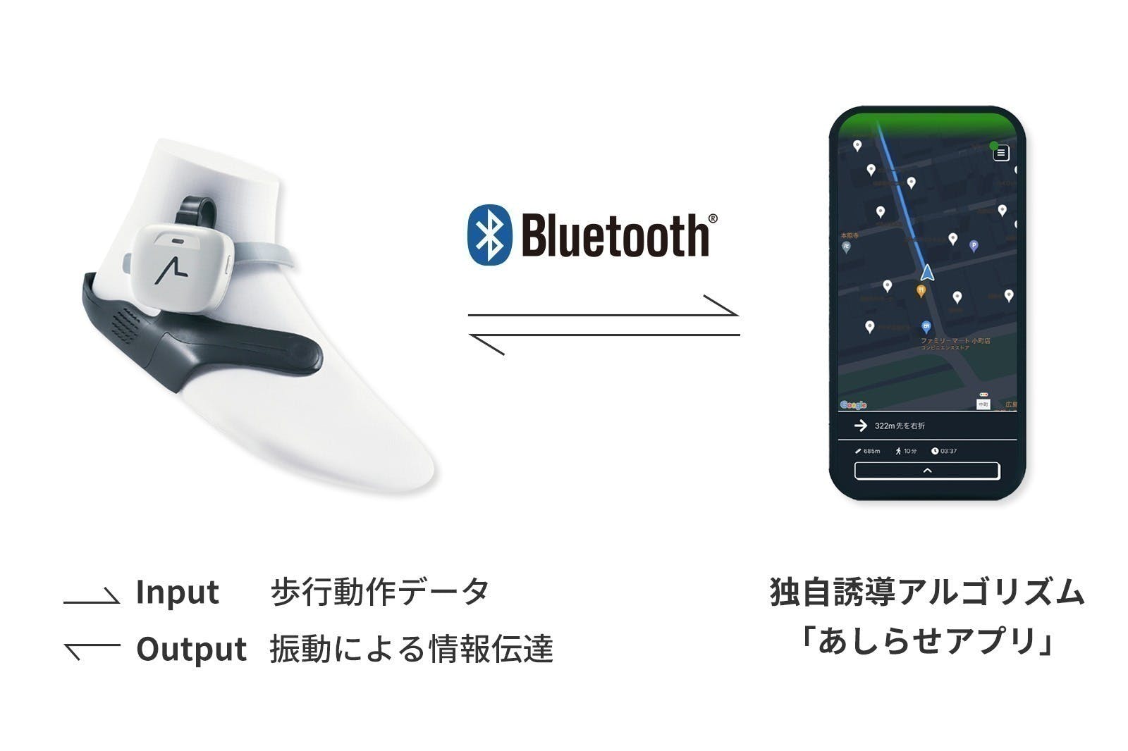 Bluetoothに対応し、専用のアプリと連携。歩行者の動作データをインプットし、誘導情報が振動という形でアウトプットされる仕組みだ。